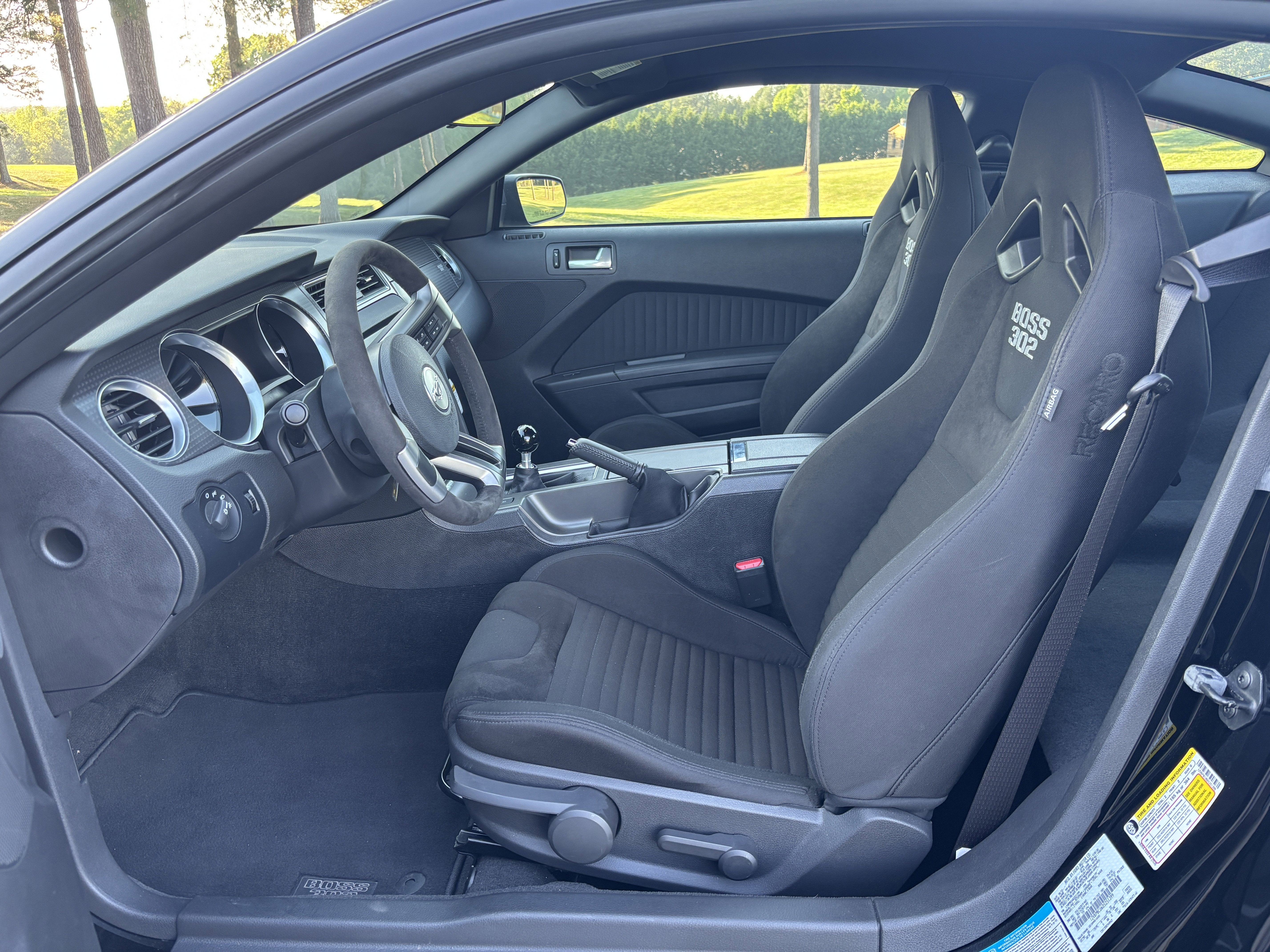RECARO Racing Seats: Charcoal Black cloth sport seats with embroidered Boss 302 logos provide maximum lateral support.